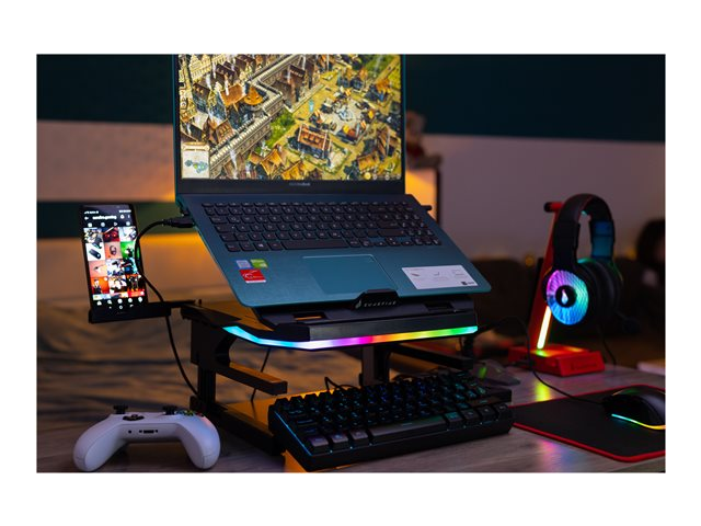 Avec 20 angles de vision réglables, 3 niveaux de hauteur, 2 supports de téléphone, des pieds pliables et un éclairage RGB, le support pour ordinateur portable de jeu Portus X2 positionne tout là où vous en avez besoin pour un jeu optimal.