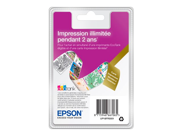 imprimante sans cartouche. Contrôlez facilement le coût de l'encre en achetant une imprimante EcoTank avec une carte « Impression illimitée ». Enregistrez votre carte dans les 14 jours suivant l'achat, puis imprimez autant de pages que vous le souhaitez pendant deux ans. Contactez simplement Epson afin d'obtenir plus d'encre et celle-ci vous sera envoyée.