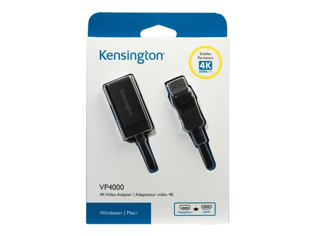 Les écrans 4K étant de plus en plus plébiscités pour les gains de productivité qu'ils permettent de dégager, Kensington vous propose une solution simple pour mettre à niveau votre ordinateur portable sans avoir à installer une carte graphique 4K. Pour cela, il vous suffit de brancher l'adaptateur vidéo VP4000 4K au port DisplayPort de votre ordinateur portable et de relier l'autre extrémité au port HMDI d'un écran, d'un projecteur ou d'un téléviseur pour afficher votre contenu en Ultra HD. Un adaptateur qui vous permet d'atteindre le sommet de votre productivité sur un écran.