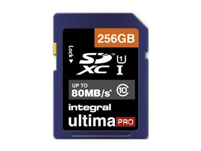Description du produit Integral UltimaPro - carte mémoire flash - 256 Go - SDXC UHS-I Type du Produit Carte mémoire flash Format Carte mémoire SDXC UHS-I Capacité de stockage 256 Go Indice de vitesse UHS Class 1 / Class10 Garantie du fabricant Garantie de 5 ans -