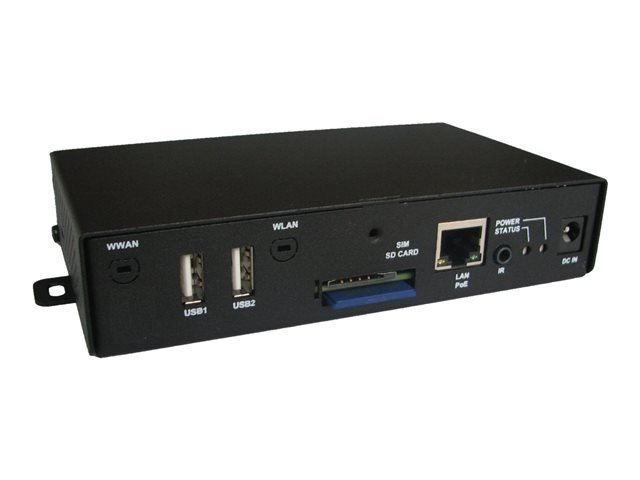 Description du produit INNES SMA300 - lecteur de signalisation numérique Type de périphérique Lecteur de signalisation numérique Dimensions (LxPxH) 14.4 cm x 8.9 cm x 2.9 cm Processeur Freescale i.MX6 Cartes mémoire flash prises en charge Carte mémoire SD Carte mémoire flash incluse Carte mémoire SD - 4 Go Résolution de sortie 1080p Interfaces USB 2.0, Fast Ethernet, Wi-Fi Formats de photos numériques pris en charge GIF, JPEG, PNG, SVG Formats audio pris en charge AAC, MPEG1 Layer2, MP3 Formats de lecture vidéo MPEG-2, WMV, H.264 Système d'exploitation fourni eLinux 2.6 Garantie du fabricant Garantie de 3 ans -